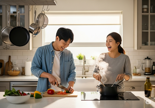 요리 데이트는 즐겁고 로맨틱하지만, 그 안에는 결혼 생활의 핵심인 '분담'과 '협력'의 요소가 숨어 있습니다. 🧑🍳👩🍳