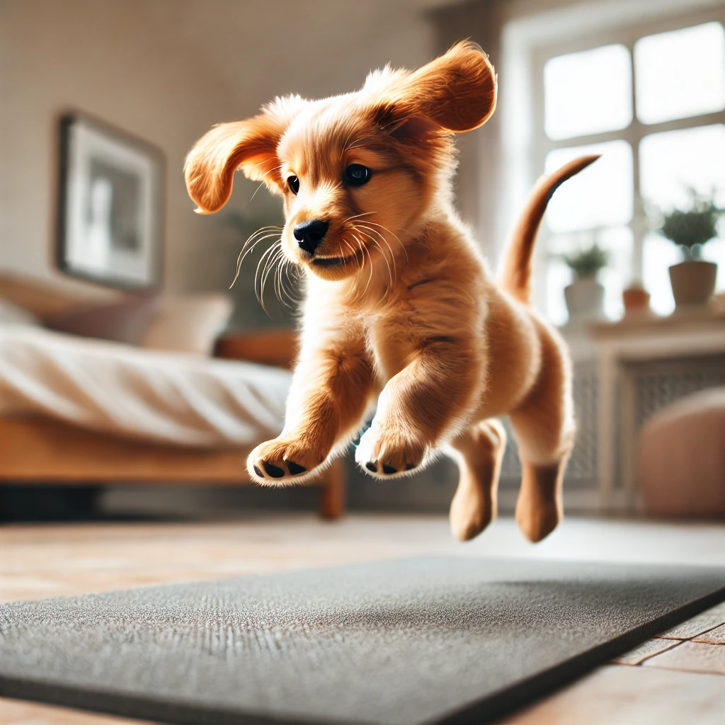 강아지가 미끄러운 바닥에서 뛰거나, 높은 곳에서 점프하면 관절에 부담이 커져요!