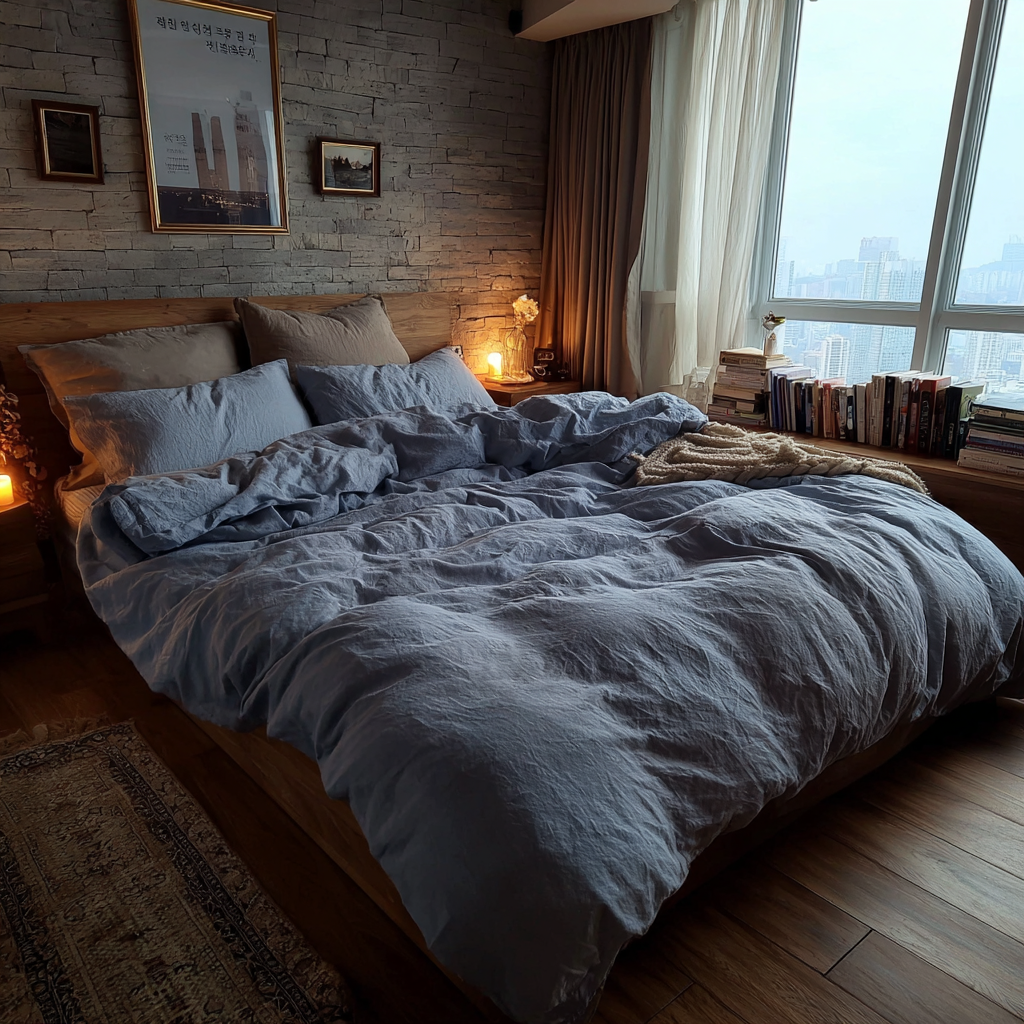 - 침구(Bedding): 원룸에서 침대는 가구 중 가장 큰 덩어리입니다. 화려한 꽃무늬나 캐릭터 이불보다는 호텔식 화이트 침구, 혹은 린넨 소재의 솔리드 컬러 침구를 선택하세요. 베개 커버 색상을 다르게 하여(믹스 앤 매치) 포인트를 주는 것이 훨씬 세련돼 보입니다.