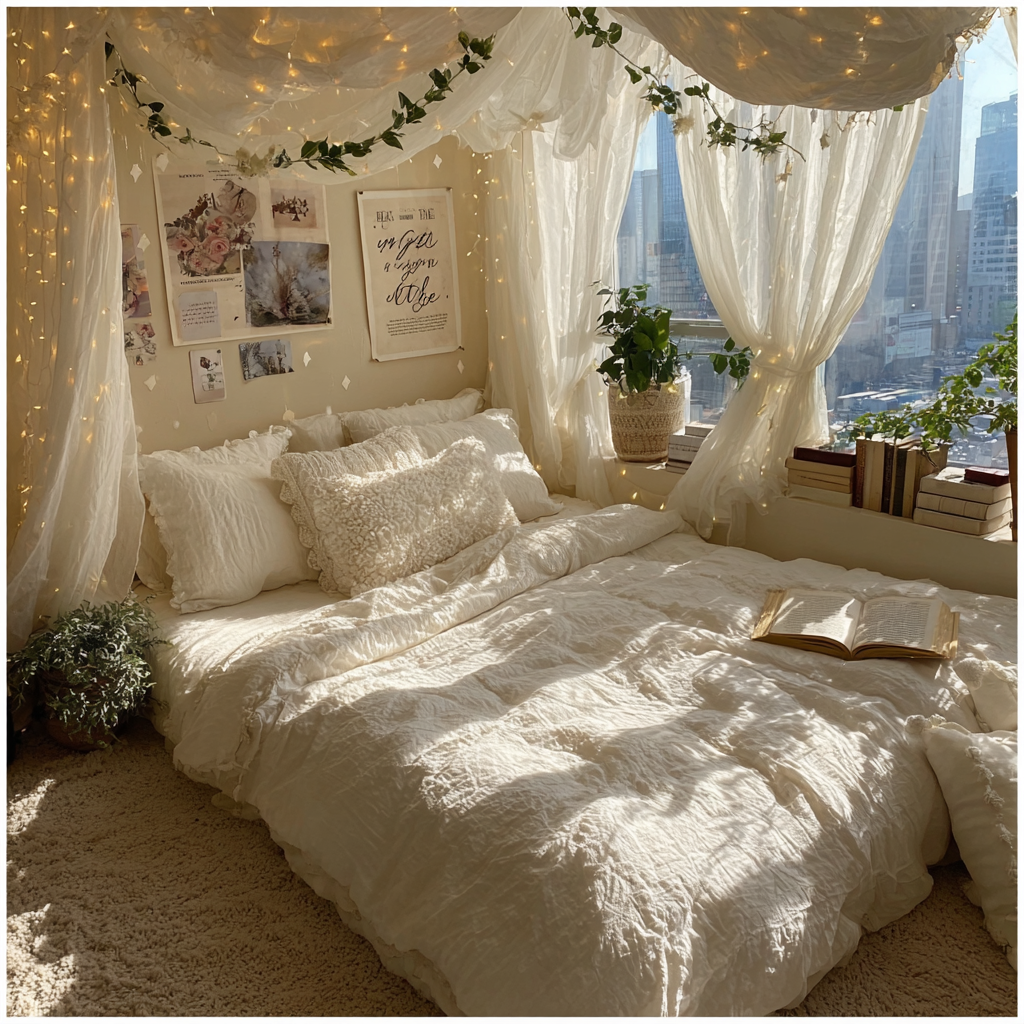- 베이지 & 우드: 화이트 쉬폰 커튼 + 베이지색 침구 + 우드 스탠드 조명 + 아이보리 러그. 가장 호불호가 없고 따뜻하며, 공간이 넓어 보이는 조합입니다.