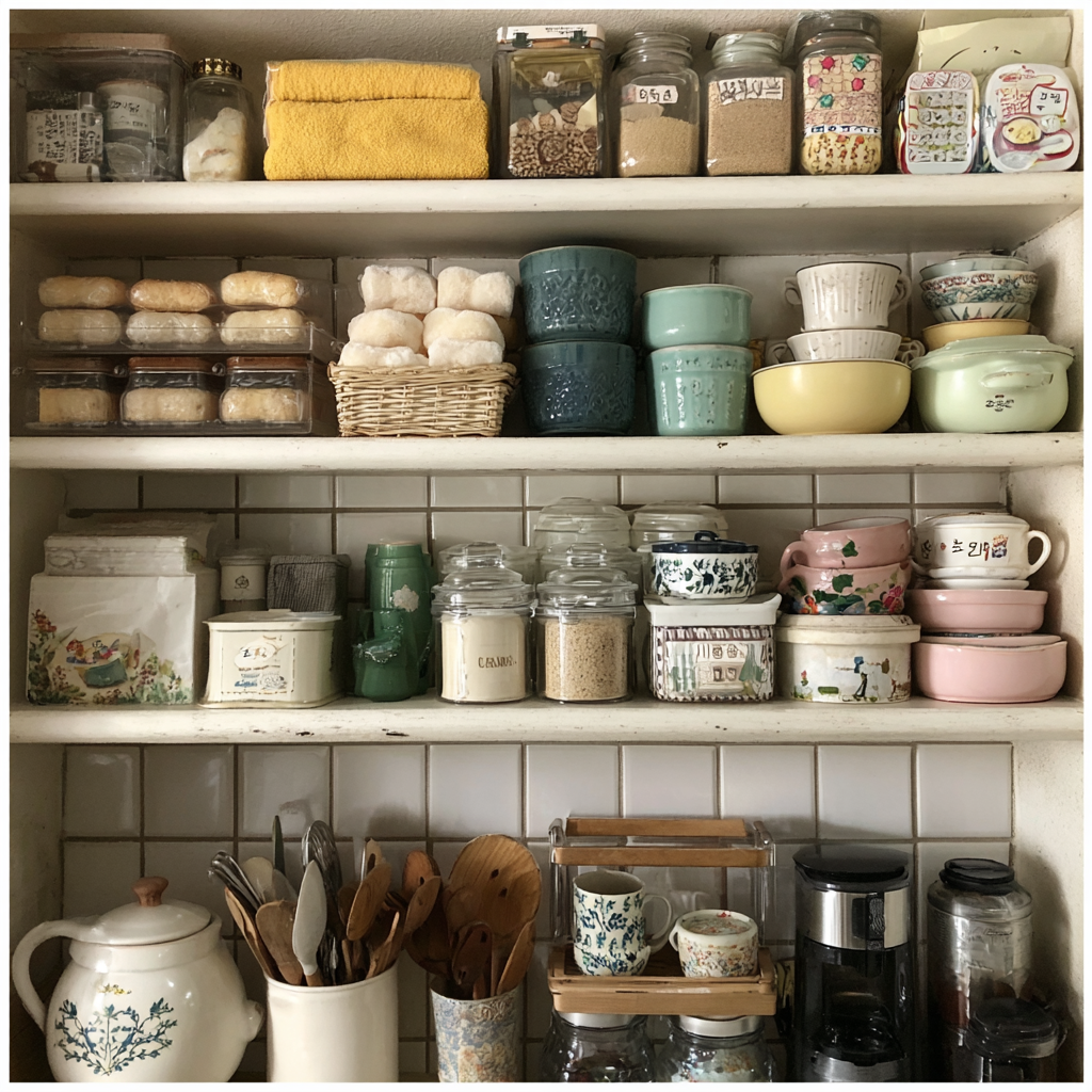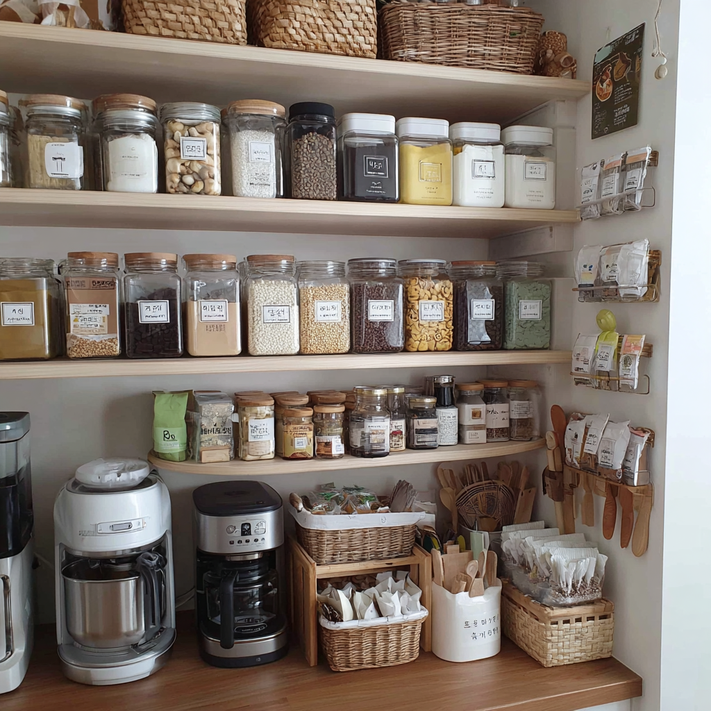 ● 투명 용기의 사용: 가루 식재료나 곡물은 투명한 용기에 담아 수직으로 배치하세요. 잔량을 한눈에 확인할 수 있어 불필요한 중복 구매를 막아줍니다.