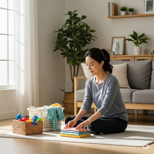 - 3.1.1. 청소는 '위에서 아래로, 안에서 밖으로': 청소할 때는 먼지가 떨어지는 것을 고려해 높은 곳(선반, 창틀)부터 낮은 곳(바닥)으로, 안쪽(방)부터 바깥쪽(거실)으로 하는 것이 효율적입니다.