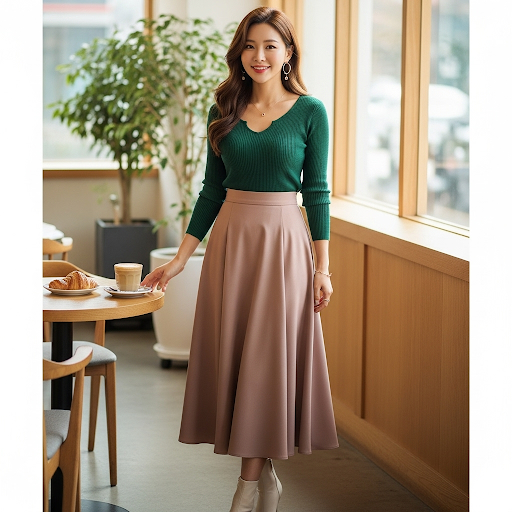 - A라인 스커트: A라인 스커트는 허리는 잘록하게, 힙은 볼륨감 있게 보이게 하여 모래시계 체형과 유사한 실루엣을 만들어줍니다.
